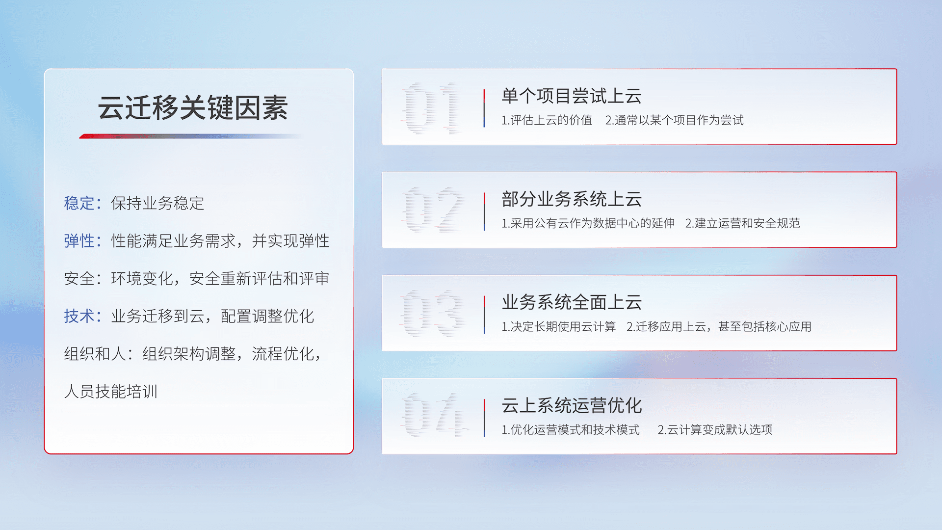 结合实际业务,,,,从规划设计、、云平台选型、、、、云原生改造、、、数据迁移、、、、集成交付,,,迁移全过程为客户识别最佳上云路径,,做好风险识别管理,,设计网络架构、、身份权限、、、安全审计合规、、、、操作审计、、、日志审计、、监控告警策略、、、多站点容灾设计等,,,,对云上基础设施进行整体规划,,提升IT治理水平,,,以满足弹性、、高可用、、、高性能的需求。。。
