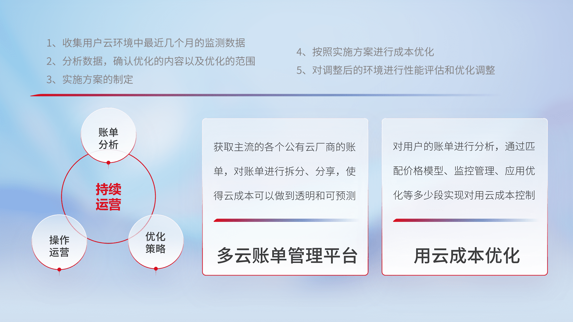 通过多云纳管,,,以统一的资源数据模型把客户的云资源进行抽象和封装,,,,进而实现对多云资源的统一操作,,,,保障云资源管理的可靠性、、、、稳定性与可用性。。。。量身定制化运维内容,,配置、、、开发运维、、、补丁管理、、、、备份、、监控、、认证和访问管理、、审计和日常巡检等,,,,保障在用云过程中的可靠度,,,稳定度以及高可用率。。