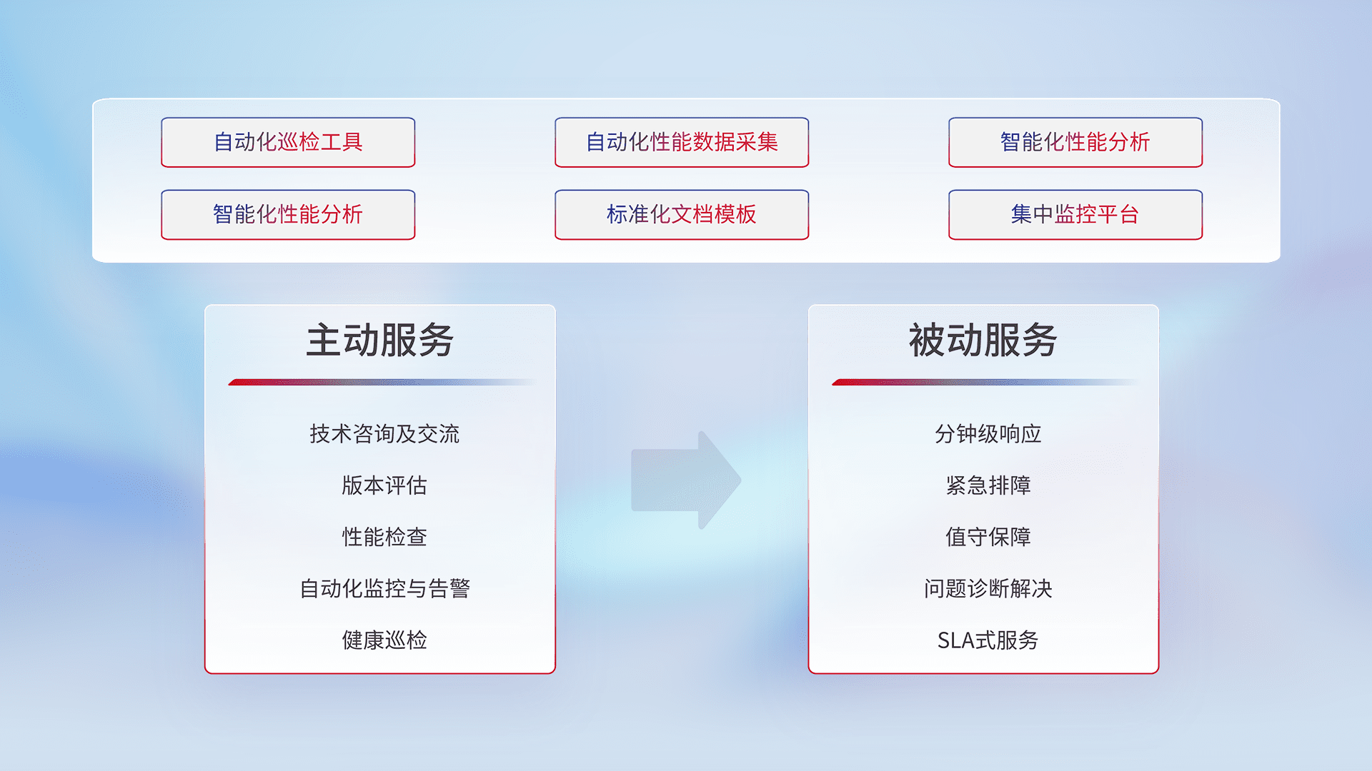 智能化工具和标准化文档,,保障服务质量,,提供主动服务(包含技术咨询、、版本评估、、、、性能检查、、自动化监控与告警、、健康巡检)和被动服务包含(分钟级响应、、、紧急排障、、值守保障、、、问题诊断解决、、SLA服务)。。。